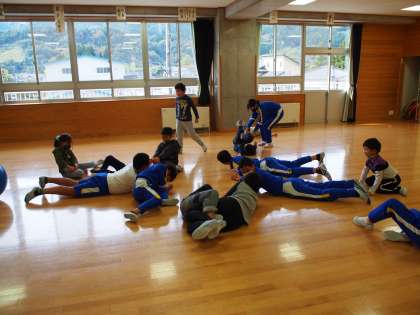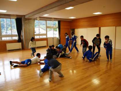 多目的室をのぞくと、いろいろな学年の子供が入り交じって、「大根抜き」をやっていました。年齢に関係なく、楽しく遊べるっていいですね。