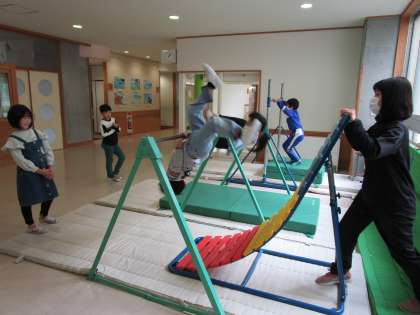鉄棒コーナーでは、1年生が担任の先生と逆上がりの練習をしていました。4年生も一緒に鉄棒をしていました。