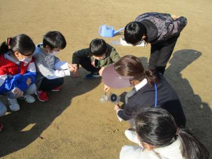虫眼鏡を使って太陽の光を集める実験をしました。