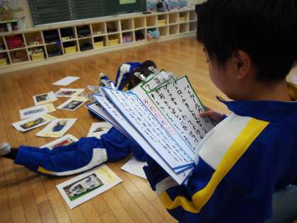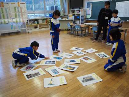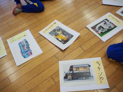 1年生の国語では、「じどう車くらべ」のまとめの学習として、自分たちで調べて、いろいろな自動車の「しごと」と「つくり」をカードにまとめました。