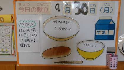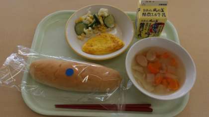 今日の献立は、コッペパン、牛乳、チーズオムレツ、カラフルサラダ、マカロニスープです。