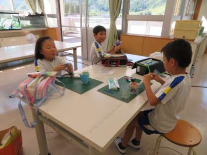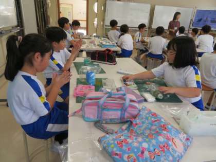 「空きようきのへんしん」では、紙粘土に絵の具を混ぜて自分のイメージに合う色を作り、容器に付けています。一人一人が自分の思い描く作品づくりに熱心に取り組んでいます。