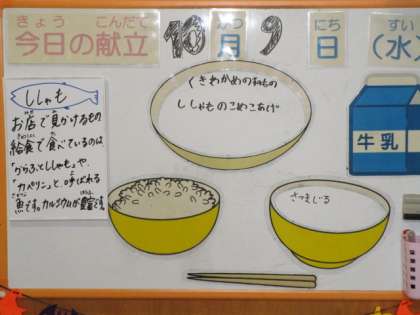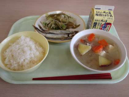 今日の献立は、ごはん、牛乳、ししゃもの米粉揚げ、茎わかめの酢の物、さつま汁です。