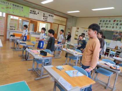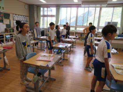 黒板に貼ったアルファベットの大文字と小文字を見ながら、歌を歌ったり、隠された文字を歌わず拍手をしたりしながらウォーミングアップをしました。