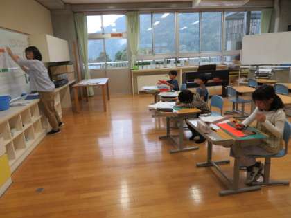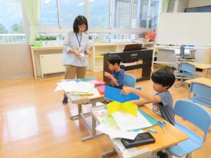 「まどから こんにちは」の学習では、安全にカッターを使って窓のある作品をつくっています。