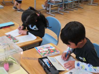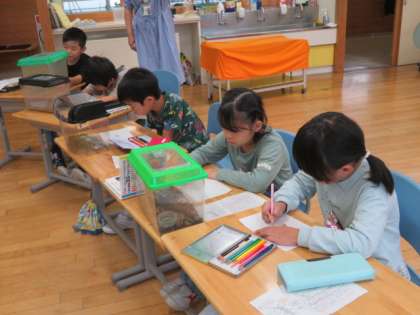 その学習を生かして、今日は、自分の決めた生き物の絵を描きました。自分が知らせたこと見せたいことを、絵や文でこれから表現していきます。