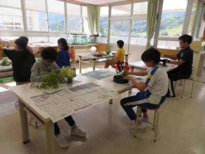 社会の学習で、室町時代の文化を学んでいる6年生。今日は、生け花体験を行いました。