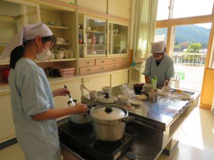今日は、らっきょう栽培でお世話になった地域の方を3名お迎えして、会食をする日です。今日のメニューは、鍋で炊いたご飯、味噌汁、各自が考えたらっきょう料理です。