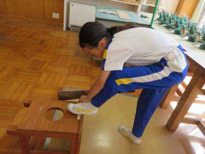 時間をかけてのこぎりを使う技能が身に付くように、担当教員もがんばります。