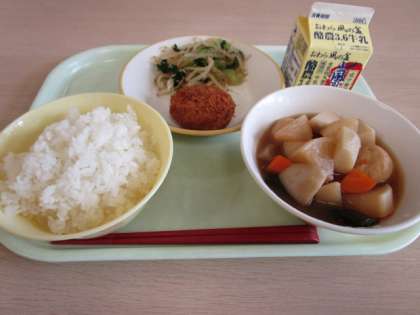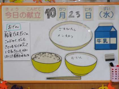 今日の献立は、ごはん、牛乳、メンチカツ、ごまびたし、おでんです。