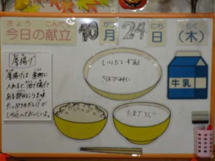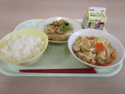 今日の献立は、ごはん、牛乳、さばのみそ煮、いり大豆和え、卵とじです。