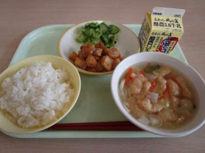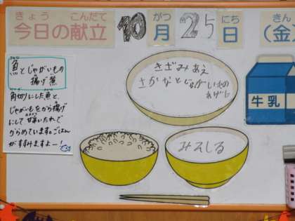 今日の献立は、ごはん、牛乳、魚とじゃがいもの揚げ煮、きざみ和え、みそ汁です。