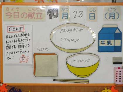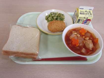 今日の献立は、食パン、牛乳、かぼちゃコロッケ、アスパラサラダ、ポークビーンズです。