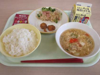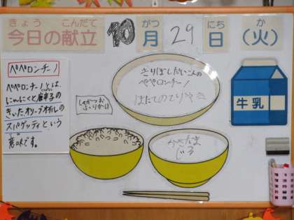 10月29日(火) 今日の給食 公開日 2024/10/29 更新日 2024/10/29 職員室より 今日の献立は、ごはん、牛乳、ほたての照焼き、切干大根のペペロンチーノ、かきたま汁、しそかつおふりかけです。