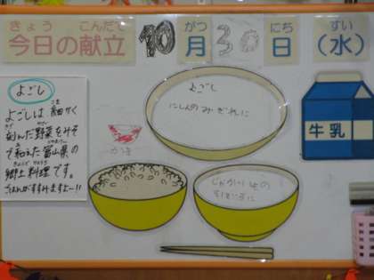 今日の献立は、ごはん、牛乳、にしんのみぞれ煮、よごし、じゃがいものそぼろ煮、柿です。