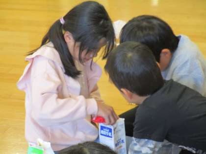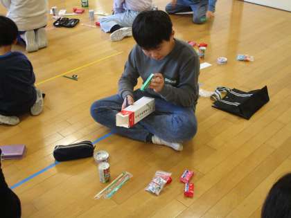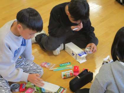 3回目の防災教室を行いました。今回は、牛乳パックを使った一人用非常食セットづくりでした。ビスコや野菜ジュースのように栄養価を考えたもの、キシリトールガムや歯ブラシのように、口腔衛生を保つためのもの等が入っています。賞味期限を調べて書き込んだり、うまく入るように友達と相談したりして、自分の非常食セットができあがりました。マスク(個包装のもの)は、一人一人大きさが違うため、お子さんに合った大きさのものを準備して非常用セットに入れてください。