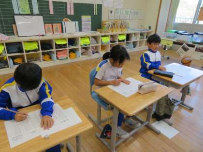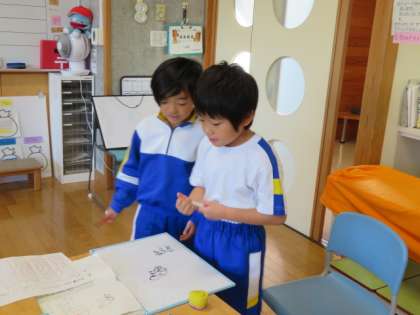 2年生は、かけ算の復習プリントを、1年生は繰り上がりのあるたしざんの学習をがんばっていました。そのプリントを終えた2年生が、困っている1年生に優しくアドバイスをしていました。