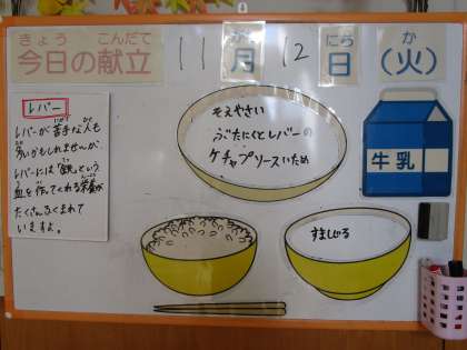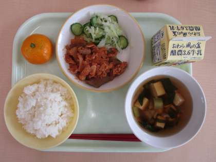 今日の献立は、ごはん、牛乳、そえ野菜、豚肉とレバーのケチャップソース炒め、すまし汁です。