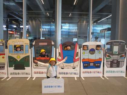 富山駅で記念撮影をして、次は市内電車で岩瀬浜へ向かいました。