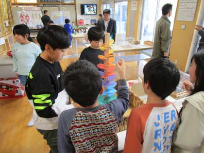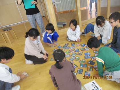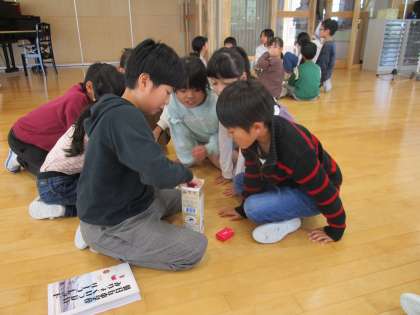 班ごとの活動です。それぞれの班で、非常用持ち出しセットを紹介したり、様々なゲームをしたりしながら、仲良く活動しました。朝日丘小学校の校内を案内してもらったときには、神通碧小学校との違いに驚きながら興味津々で回っていました。