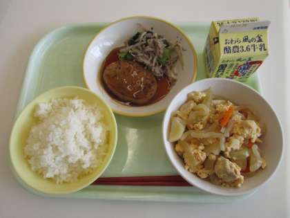 今日の献立は、ごはん、牛乳、照り焼きハンバーグ、ゆかり和え、卵とじです。