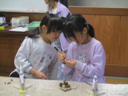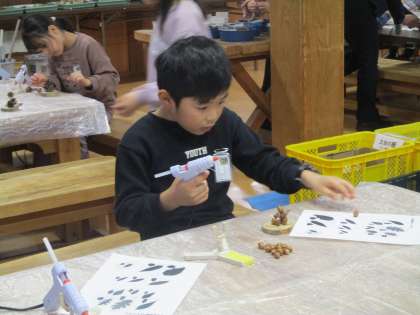 午後の活動は、「木の実でつくろう」でした。様々な種類のどんぐりやまつぼっくり、乾燥させたお花等を使って、置物をつくりました。子供たちの発想の豊かさに驚きの連続でした。また、欠席した友達を思いやるすてきなやりとりが見られました。