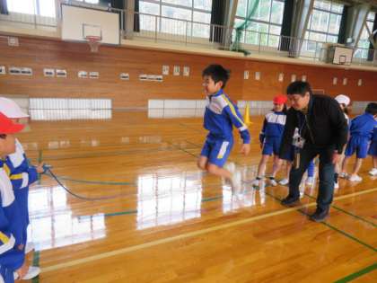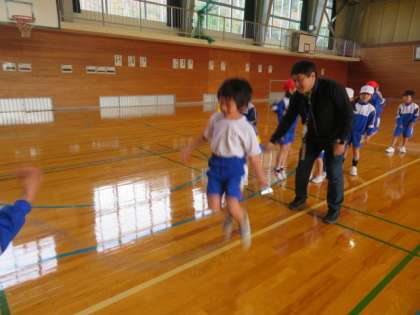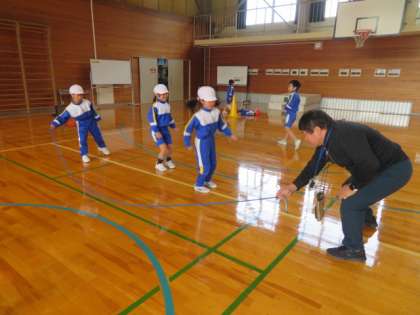 1年生は、8の字跳びができるようにがんばっています。まずは、「ゆうびんやさん、落とし物・・・」の歌に合わせて、大縄に慣れるよう取り組みました。