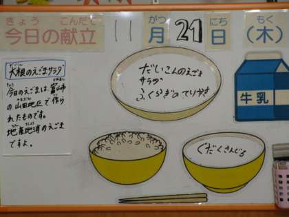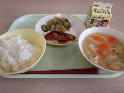 今日の献立は、ごはん、牛乳、ふくらぎの照り焼き、大根のえごまサラダ、具だくさん汁です。