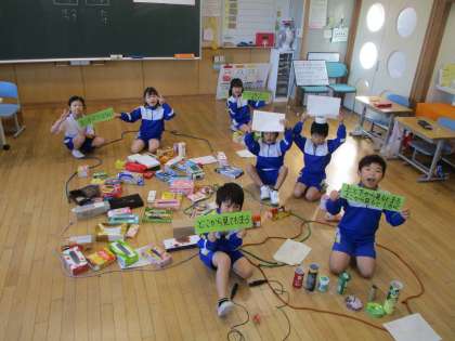 算数科では、それぞれが持ってきた箱を仲間分けしました。
