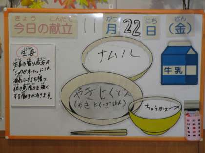 今日の献立は、焼肉丼(焼肉)、牛乳、ナムル、中華スープ、味付け小魚です。