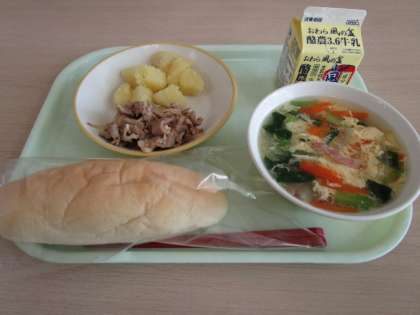 今日の献立は、コッペパン、牛乳、豚肉の甘辛煮、こふきいも、卵のふわふわスープです。