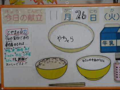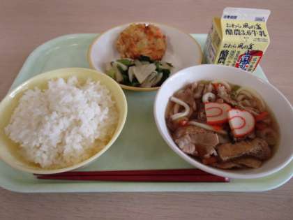 今日の献立は、ごはん、牛乳、野菜かき揚げうどん(かき揚げ)、やちゃらです。