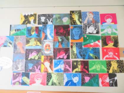 3階の掲示板に、5・6年生の版画の作品を掲示しています。