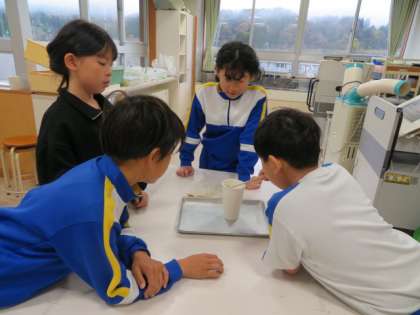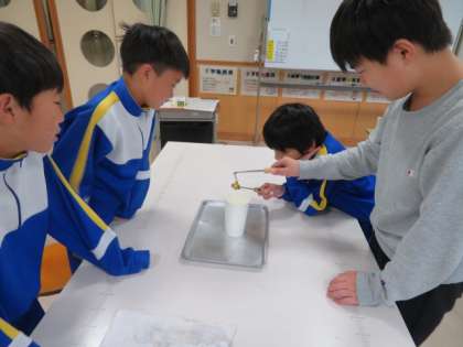 鉄道のレールが時季によって変化することを知り、金属も空気や水のようにあたたまると体積が変化するのか予想を立てました。そして、実験。初めて使う実験器具でしたが、友達と協力しながら安全に実験を行いました。