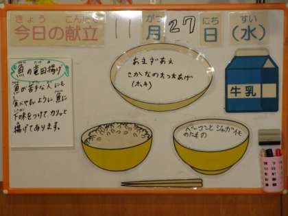 今日の献立は、ごはん、牛乳、魚の竜田揚げ、甘酢和え、ベーコンとじゃがいもの煮物です。