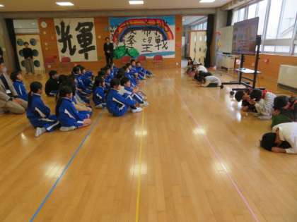 グループごとに交流を行った後は、4年生が学習発表会で発表した防災に関する劇「ミドリさん」を、朝日丘小学校の4年生に見てもらいました。