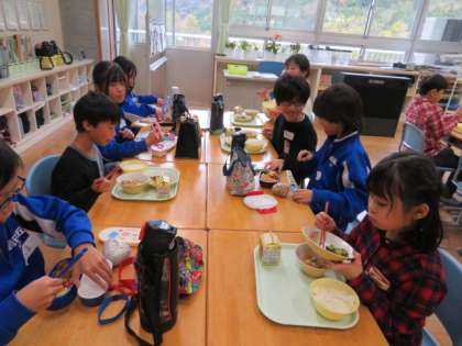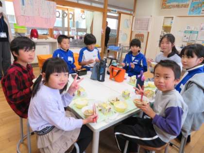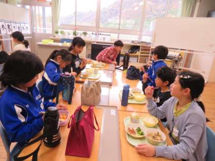 たくさん活動した後は、班ごとの会食です。碧っ子は給食を、朝日丘の子供たちはお弁当での会食です。
