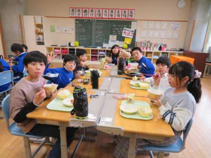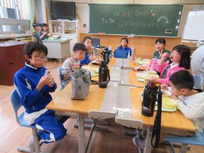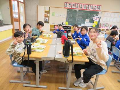「朝日丘小学校の給食との違いはありますか?」と聞くと、子供たちは、「食器やトレーの色が違います。餃子は給食に出ます。」と教えてくれました。