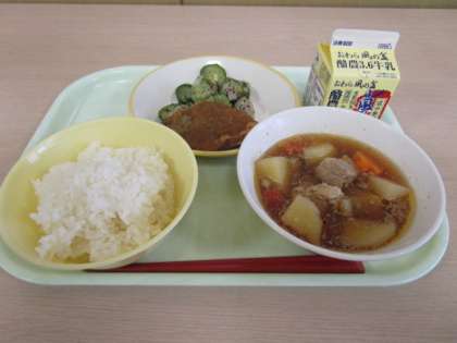 今日の献立は、ごはん(有機米)、牛乳、揚げ魚のみぞれだれ、ゆかり和え、豚肉とじゃがいもの南蛮煮です。