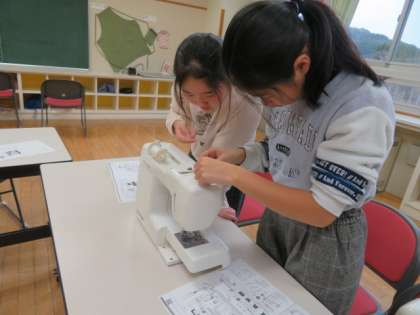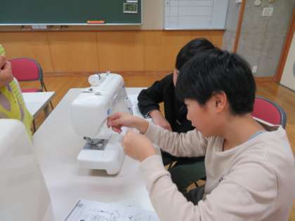 今日は、ミシンの部分名をワークシートを見ながら、確認することから始めました。実際にミシンを操作し、各部分の動きを確かめながらペアの友達と学んでいました。その後、上糸をかけたり、ボビンを入れたりと初めての作業に戸惑いながらも真剣に取り組んでいました。