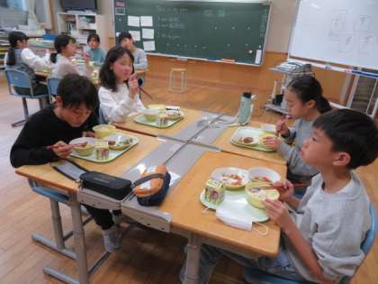 上学年の教室でも、嬉しそうに給食を食べていました。