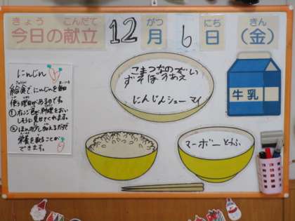 今日の献立は、ごはん、牛乳、にんじんシューマイ、小松菜の大豆そぼろ和え、マーボー豆腐です。