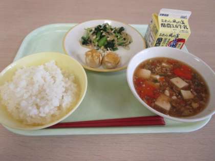 今日の献立は、ごはん、牛乳、にんじんシューマイ、小松菜の大豆そぼろ和え、マーボー豆腐です。