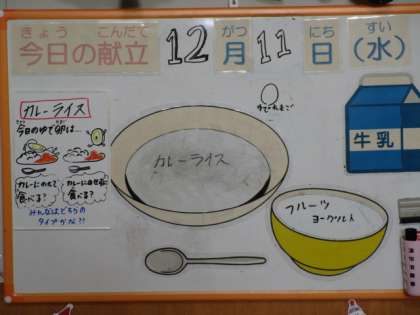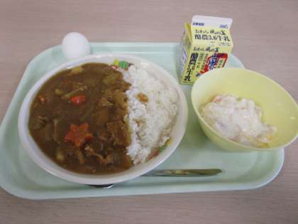 今日の献立は、牛乳、カレーライス、ゆで卵、フルーツヨーグルトです。