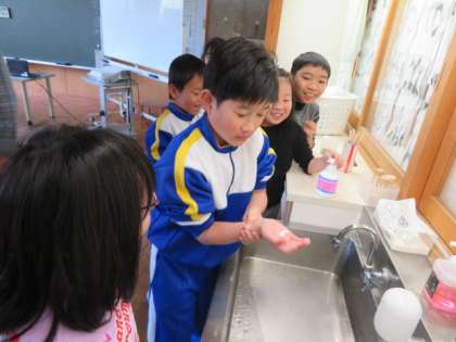 「体のせいけつ」では、今日は手洗いから学習が始まりました。