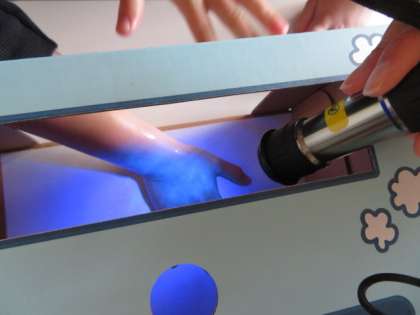 自分の手の洗い方や汚れの落ち方を見るために、手洗い後の手に「まほうのクリーム(手洗いチェッカー)」を塗り、ブラックライトで汚れが落ちていないところを確認しました。