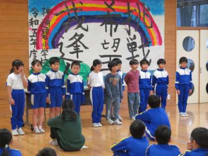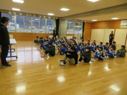 地区児童会の前に行った朝のつどいでは、二つのことを行いました。