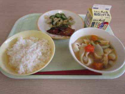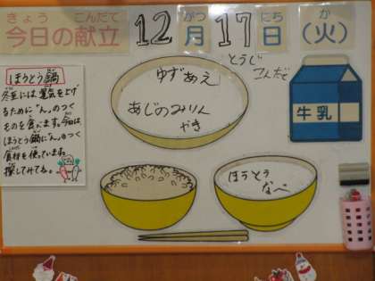 今日の献立は、ごはん、牛乳、鯵のみりん焼き、柚子あえ、ほうとう鍋です。