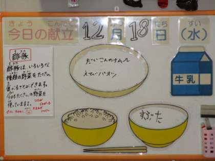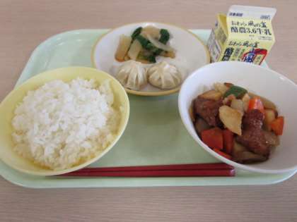 今日の献立は、ごはん、牛乳、えび包子、大根のナムル、酢豚です。