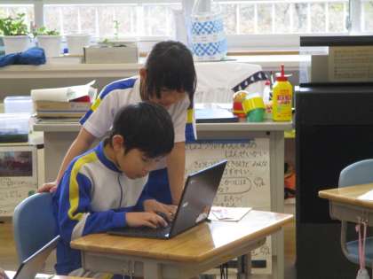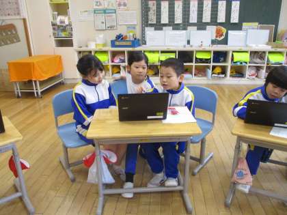 今、全校で夢作文にチャレンジしています。1年生は、初めての取組です。一人1台端末を使って下書きをして、書いたものを読み合いました。